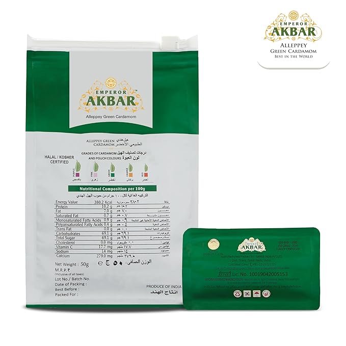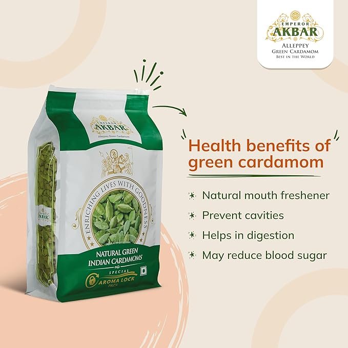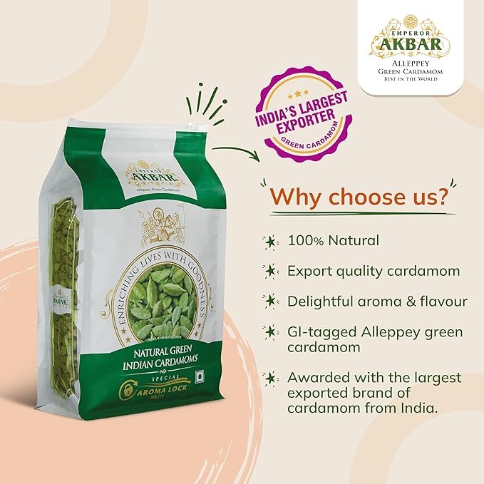 - India’s Only GI-Tagged Alleppey Cardamom: Enjoy the prestige of Emperor Akbar Green Cardamom — India’s only GI (Geographical Indication) Tagged Alleppey Elaichi, celebrated for its purity and authentic Kerala origin. Sourced from the lush spice hills of South India, it carries the signature aroma of true Alleppey quality.