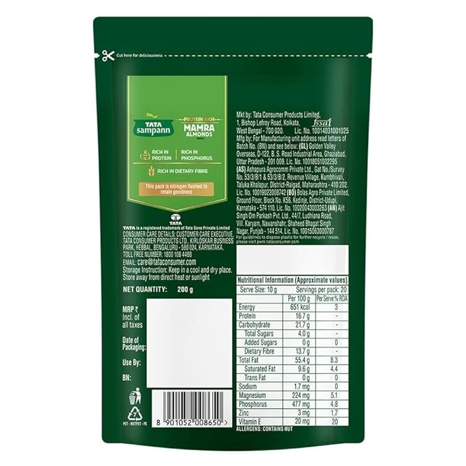 • Source of DIETARY FIBRE, phosporus: A good source of dietary fibre and phosphorus, these Tata Sampann Mamra Almonds (Whole) can aid in in contributing essential elements that support the maintenance of a balanced diet